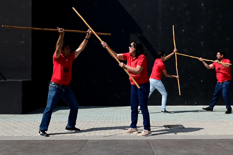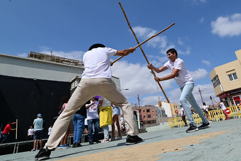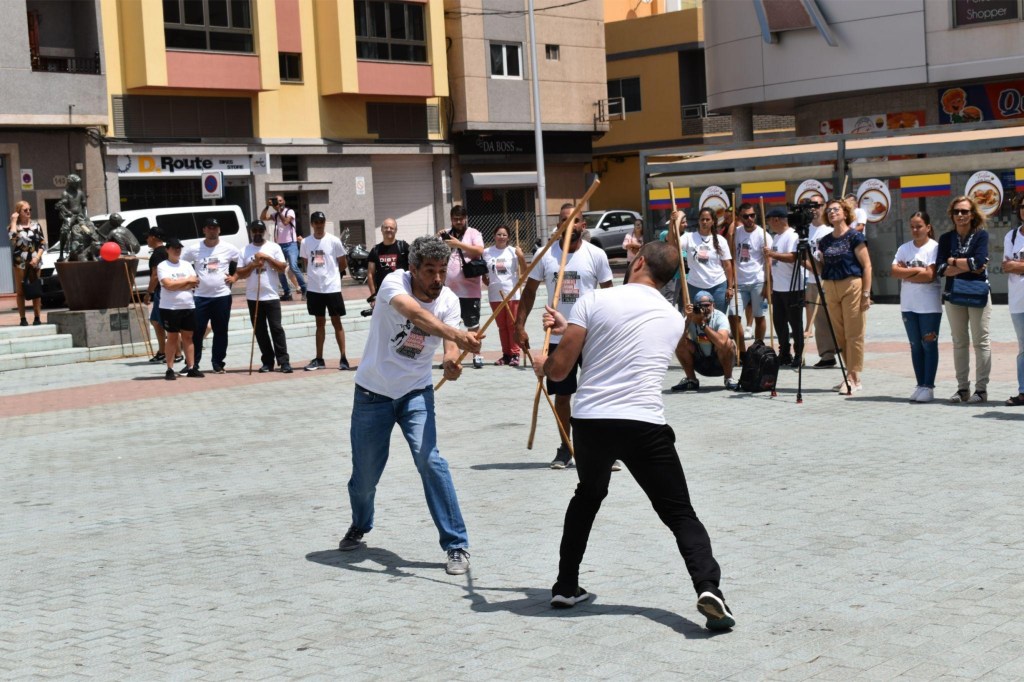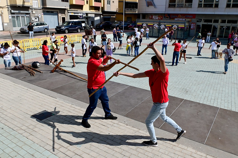 El sábado, para culminar estas Jornadas, en la Plaza de los Algodoneros, se dieron cita distintos colectivos de las islas, para realizar talleres y muestras de las distintas prácticas que la Federación del Juego del Palo aglutina en el Archipiélago Canario.