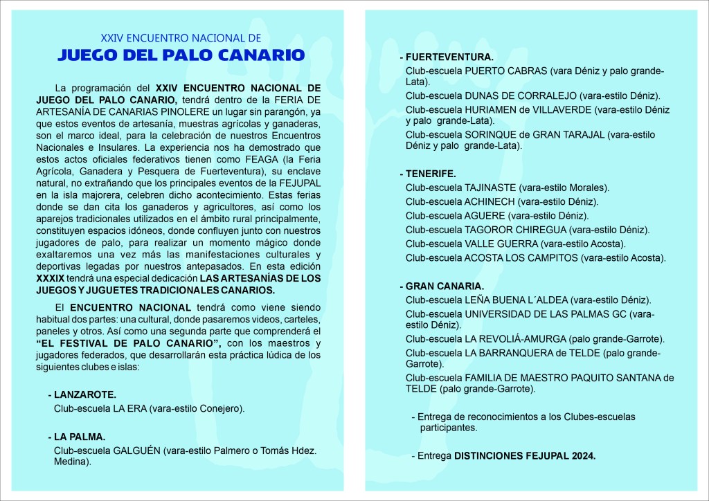 También estuvo Francisco Javier García Socas, como presidente del club-escuela TAGOROR CHIREGUA, impulsor de que este principal acto oficial de la FEDERACIÓN DE JUEGO DEL PALO CANARIO, pueda ser una realidad en la FERIA DE ARTESANÍA DE PINOLERE. De hecho, se destacó que este tipo de Ferias es el marco ideal, para celebrar los Encuentros Nacionales e Insulares, ya que estos actos tradicionales exaltan la Canariedad.