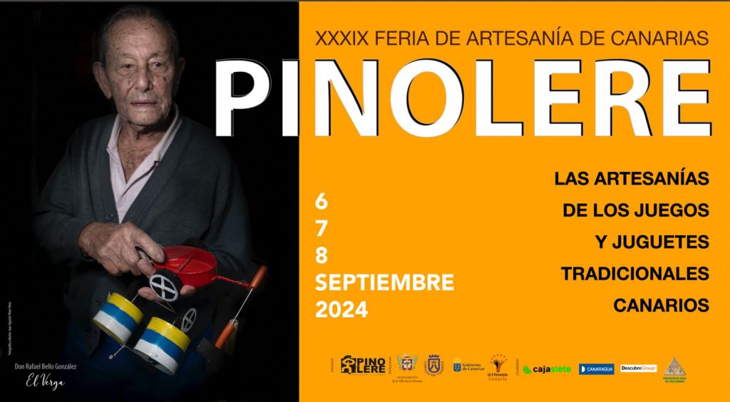 La Feria de PINOLERE cumple este año la XXXIX edición, dedicada a LA ARTESANÍA DE LOS JUEGOS Y JUGUETES TRADICIONALES CANARIOS, por lo que no es de extrañar que estuviera en el acto, el artesano de juguetes más viejo, que a sus 91 años sigue siendo un referente para todos los que se dedican a este menester y que no quieren que se pierda. El cartel de la FERIA DE PINOLERE este año está dedicado a su imagen y por tanto este año se recoge en dicho cartel, de ahí que también estuviera presente Rafael Bello González.