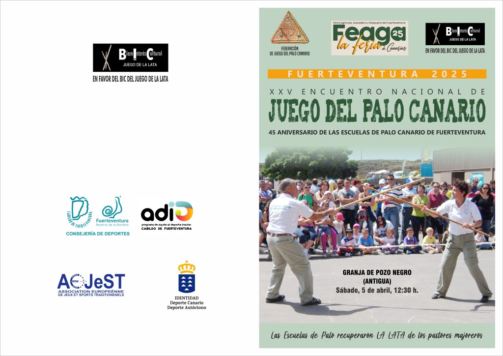 FEAGA (la Feria Agrícola, Ganadera y Pesquera de Canarias), una vez más, amplía su afluencia de los últimos años. En esta ocasión se celebrará el XXV Encuentro Nacional de Juego del Palo Canario, el día 5 de abril de 2025 a las 12:30 horas, en la Granja Experimental del Cabido de Fuerteventura de Pozo Negro (Antigua).