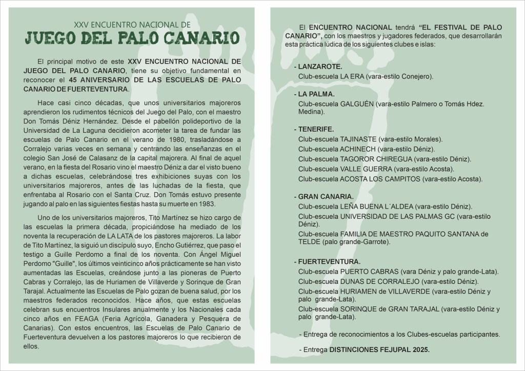 El motivo principal de ésta efemérides son los 45 AÑOS DE LAS ESCUELAS DE PALO CANARIO DE FUERTEVENTURA, ya que en el verano de 1980 unos universitarios majoreros, que habían aprendido las técnicas básicas con el maestro don Tomás Déniz Hernández, ponen manos a la obra y fundan estas escuelas. Don Tomás sigue visitando a la isla hasta su fallecimiento en noviembre de 1983, siendo varias las veces que se desplazó, casi siempre para las fiestas del Rosario, donde jugaba a la VARA (Palo Medio) con sus alumnos en los prolegómenos de las luchadas de la fiesta. El cabildo majorero siempre ha apoyado esta iniciativa, abonando el pasaje del maestro Déniz para que supervisara sus escuelas hasta su desaparición. Don Tomas Déniz decía que tenia una deuda moral con Fuerteventura, porque su abuelo era majorero.
