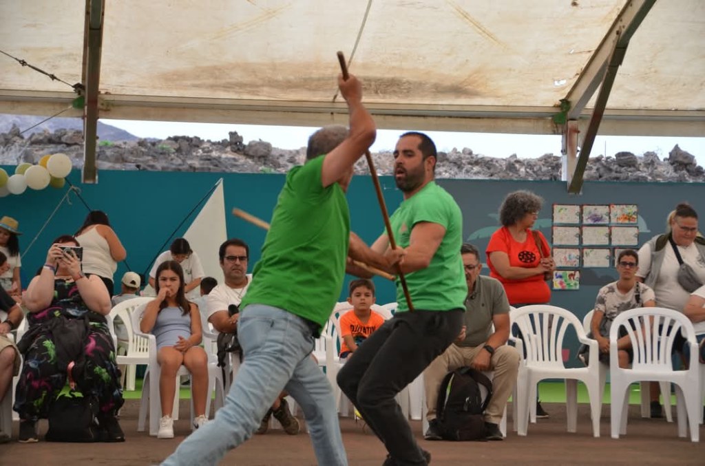 Para cerrar el Festival de Palo Canario, lo hizo como anfitriones de esta edición las Escuelas de Palo Canario de Fuerteventura, aglutinándose en las mismas las escuelas pioneras Puerto Cabras y Dunas de Corralejo, así como las que nacieron a través del programa del cabildo de Fuerteventura “NO OLVIDES LO NUESTRO”: Huriamen de Villaverde y Sorinque de Gran Tarajal. Se da la doble condición de juego, de la Vara o Palo Medio y La Lata o Palo Grande de los pastores majoreros. Por lo que la mayoría de sus jugadores pueden jugar tanto a la Vara como a La Lata. La exhibición constó de estas dos modalidades, determinantes por el tamaño de los palos y como según su dimensión, afecta al agarre del implemento y la forma de realizar sus defensas y ataques, así como su posición o cuadras. Efectuaron las muestras Los maestros Agustín Martínez García, María Nieves Vera Jiménez, José Gilberto Carballo del Toro, José Vera Pérez, Aday Mesa Martín y Francisco Manuel Dorta Castillo, quienes estuvieron acompañados por los jugadores Francisco Mederos Felipe, Laura Dorta Cabrera, Elena Dorta Cabrera, María Iballa Martínez Estévez, Cathaysa Martínez Estévez, Luis Melo Hernández, Antonio Dodero Rodríguez, Ilelziahberi Dodero Martínez, Laia Curbelo Martínez, Carmelo González Carreño, Gustavo Miguel Gopar Pérez, Laura Negrín Carmona y Mónica Rosario Alonso.