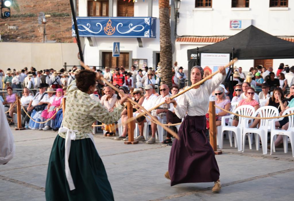 También las Escuelas de Palo Canario de Fuerteventura venían participando en los últimos años de la Romería a la Virgen de la Peña “Patrona de la isla de Fuerteventura”, en la distancia que separa Betancuria de la Vega de Rio Palmas, para terminar en la iglesia de este pago, con la ofrenda a la Virgen. Este año se suspendió la Romería debido a las olas de calor reinante y sólo se celebró la ofrenda, jugando al Palo en la misma delante de la Virgen de la Peña, las Escuelas de Palo de Fuerteventura.
